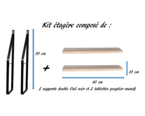 Étagère murale double bois Cali 10 avec supports métal noir est un kit complet composé de deux tablettes Peuplier massif de 60 x 10 cm épaisseur 2,2 cm.